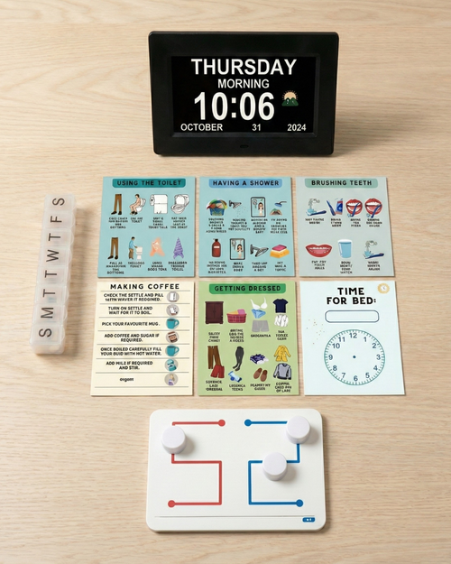 Every standard kit includes seven handpicked items designed to make everyday life safer and more manageable. Mini kits include a smaller selection of essential tools. All items are chosen with care and experience to give real support at home.